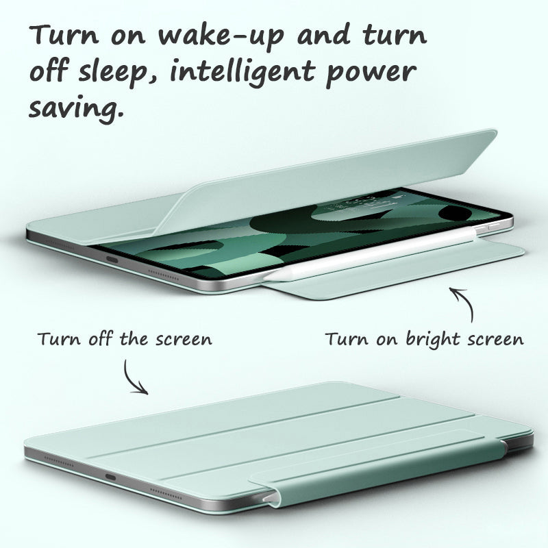 Borderless design, the iPad is simple and elegant. Made of high-quality British leather materials, the front and back covers and the leather belt clips are covered with neodymium-iron magnets (108 in total), which are strongly adsorbed on the iPad. Smart wake up and close, only 0.14 seconds. The design of the three-fold bracket makes work, reading, entertainment, etc. more convenient and stable. Lightweight and convenient, zero resistance to absorb pencil and charge.