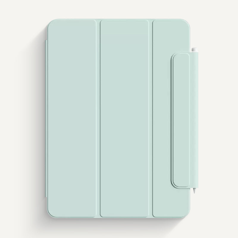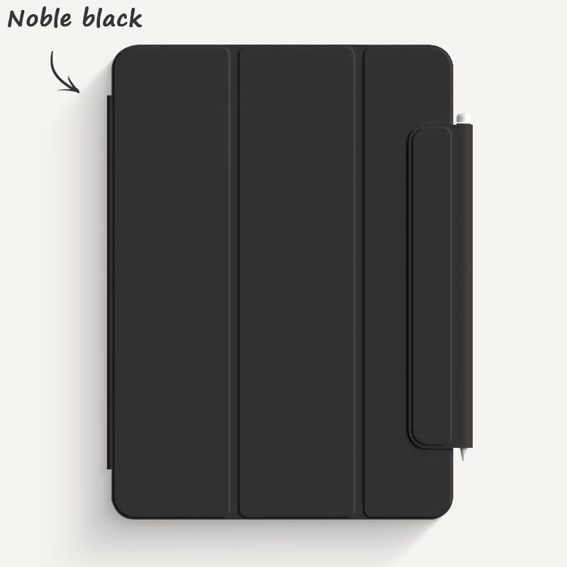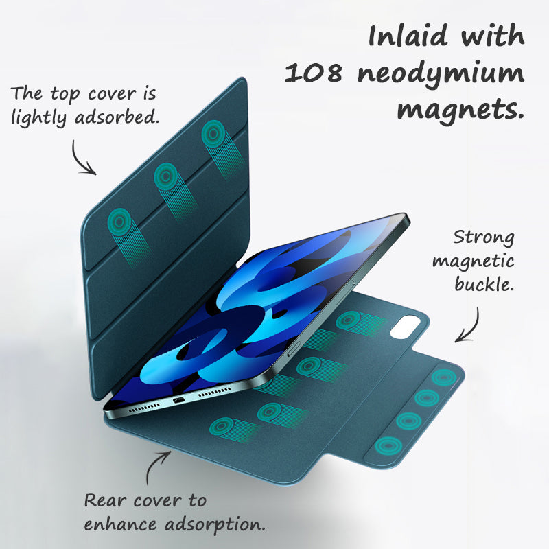 Invisible array type strong magnet (108 neodymium magnets built into the front cover and back cover and the belt clip buckle). The front cover is lightly adsorbed, and the back cover is strongly adsorbed. Automatically cling to the iPad without falling off.