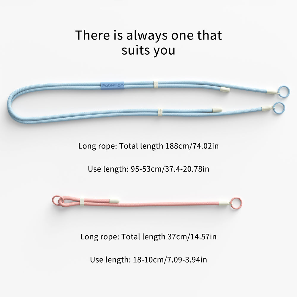 The adjustable dual-layer design comes with an improved slider, the rope wrist strap can be extended to 37cm, and the rope crossbody strap can be extended to 188cm, allowing you to wear it on your wrist or crossbody. The sturdy 8mm rope is soft and skin-friendly, yet strong enough to hold your phone, AirPods, keys, and more.