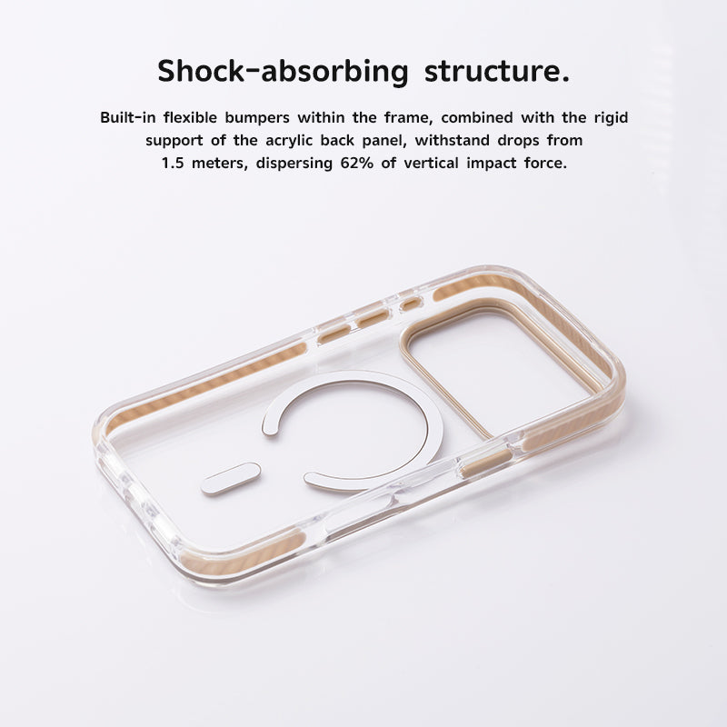 The product offers excellent drop resistance. Flexible cushioning built into the frame, combined with a sturdy acrylic back panel, effectively dissipates impact force. Testing shows that it can withstand drops from 1.5 meters and dissipates up to 62% of vertical impact force, providing reliable protection for your phone.